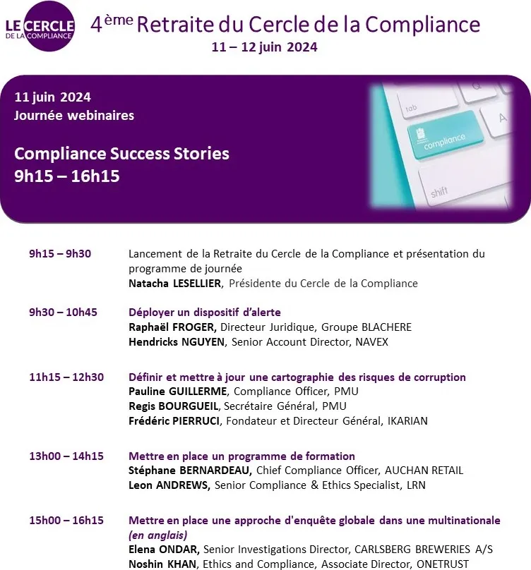Cet événement en présentiel sera précédé d’une journée de webinaires « Compliance Success Stories » au cours desquels des solutions pratiques à des problématiques concrètes seront présentées par les entreprises qui les ont mises en œuvre.
